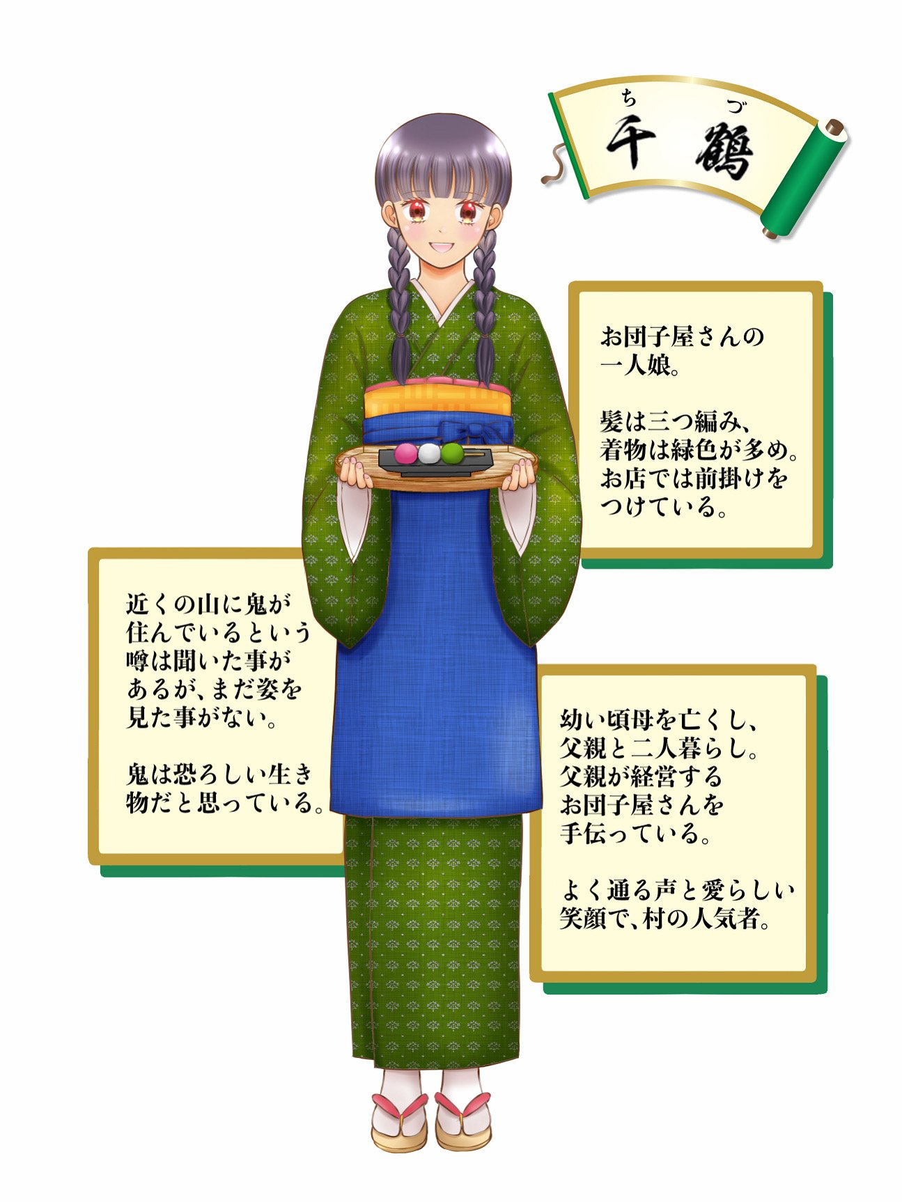 赤鬼のアケノと青鬼のミヤビを紹介しましたが、今回は普通の人間の女の子、千鶴(ちづ)です。