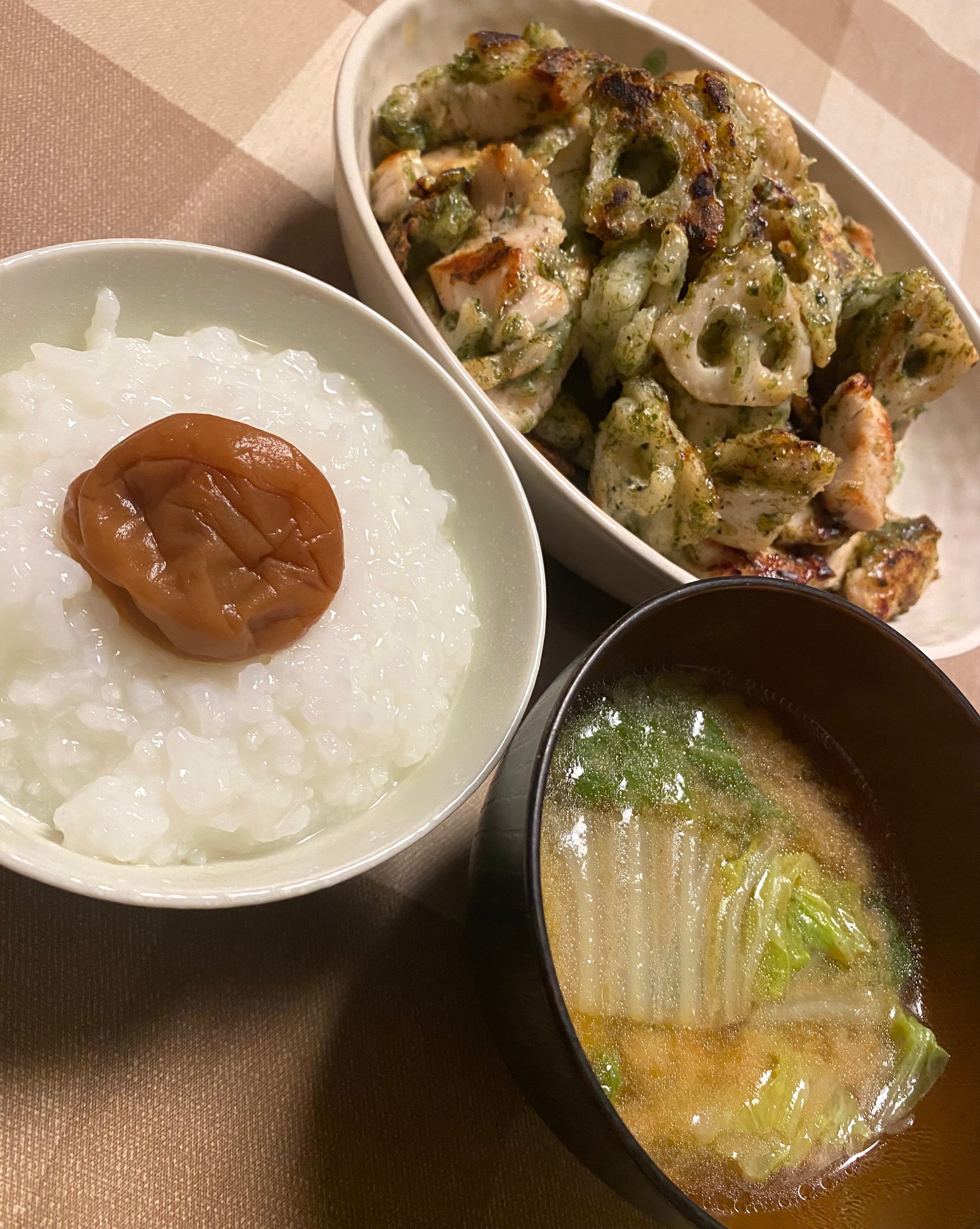 お粥、白菜と天かすのお味噌汁、レンコンと鶏肉の青のり炒め作りました!