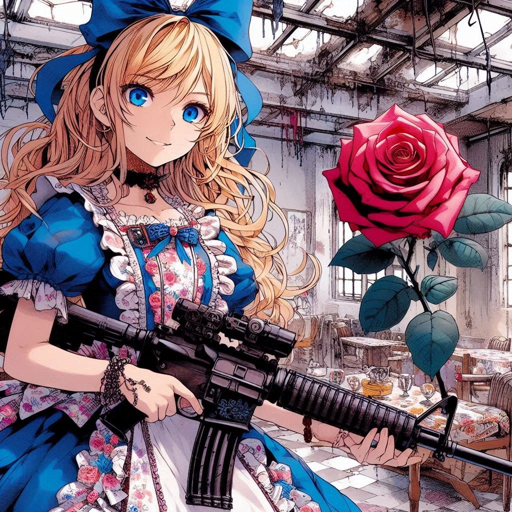 荒廃した建物の中で無骨なライフルを構える可憐なアリス。