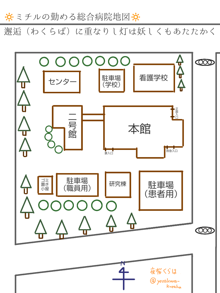 おまけ、というのもなんですが、この作品の主人公「ミチル」の勤める総合病院の地図を描いたので載せますね。