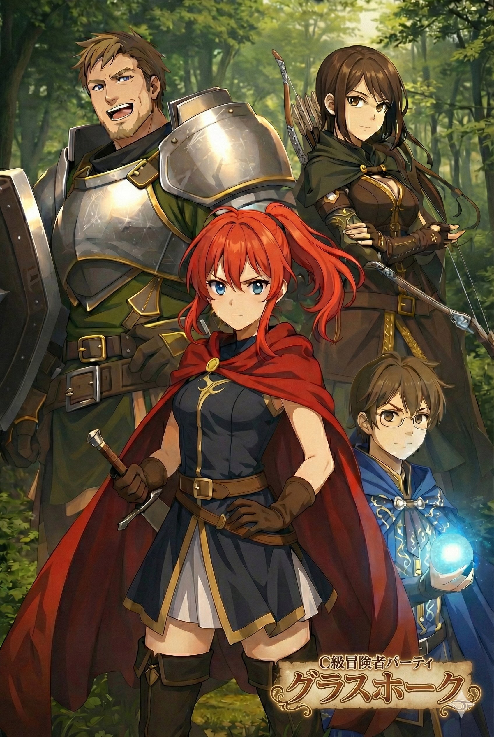 リーダーの女戦士アイナ、盾役のバルグ、弓のメリス、魔術師リオットの4人組冒険者パーティ「グラスホーク」