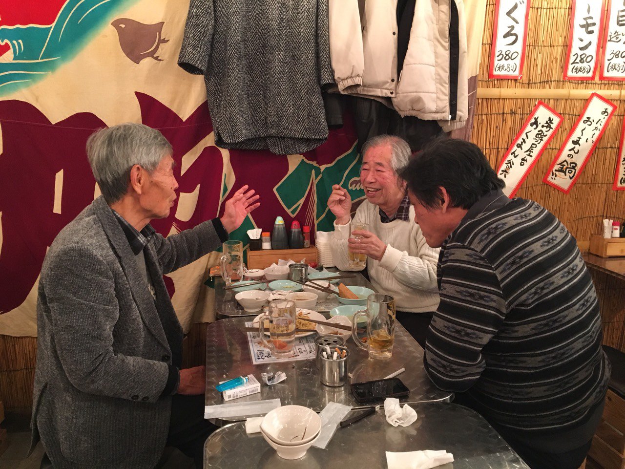 居酒屋では、よく話した。京都大学で社会学を勉強しようと思ったけれども、社会学というのは当時有名でなくてそういう講義がなかったということと、入試に田中美知太郎がいたこと、故郷の村を出るとき女性にモテまくって女性がずっと追いかけてきたというモテエピソード等の真偽不明の話の数々に、佐伯晋とともに茶々を入れた。