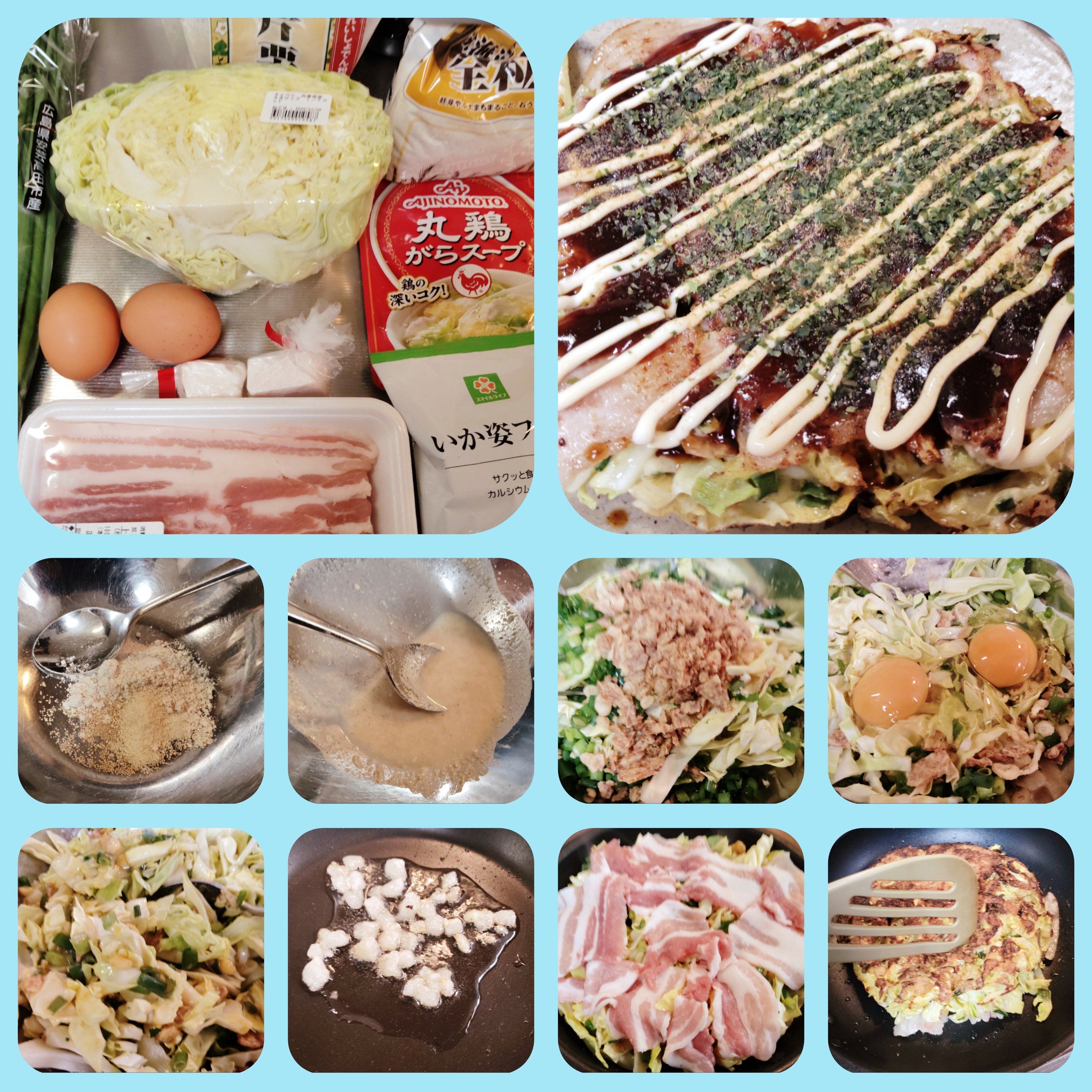 私がお好み焼きを焼くときは、もうこのレシピだけ。具をイカ(あたりめ)にしたり、ちくわにしたり、ネギ焼きにすることもありますが、基本的にこのレシピの応用です。外のお好み焼きがそんなに美味しくないのに高いので、外で食べる事が少なくなりました。先日作った広島風お好み焼きには満足しているので、また作りたいですね。