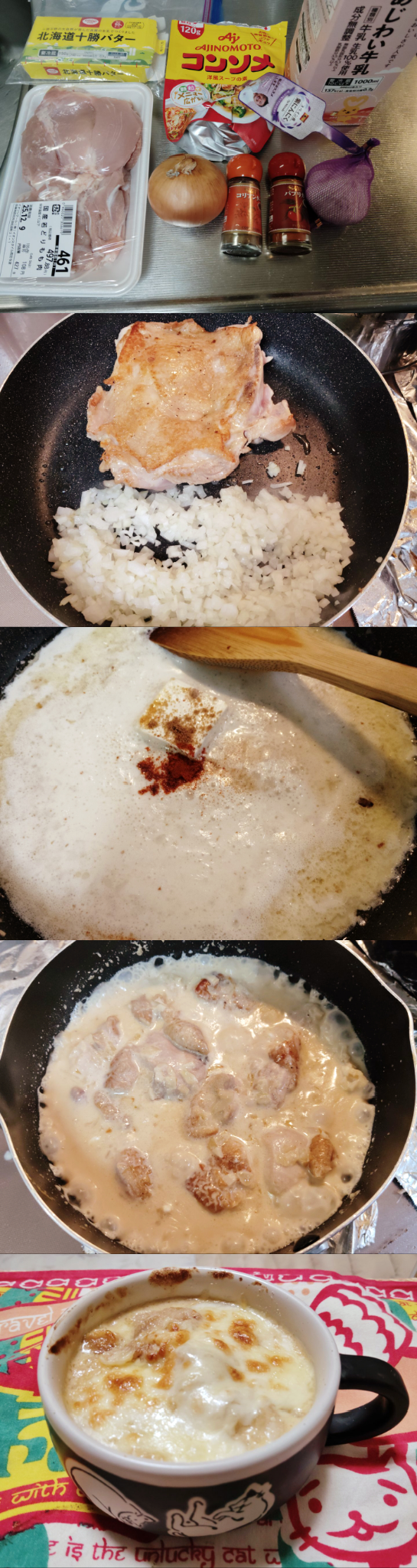 ※本場は生クリームとか使うのですが、無かったのでキリのクリームチーズをひとつ使いました。仕上げにチーズをのせてオーブンで焼くと美味しいので、やりたい方はピザチーズを用意しましょう(超推奨)