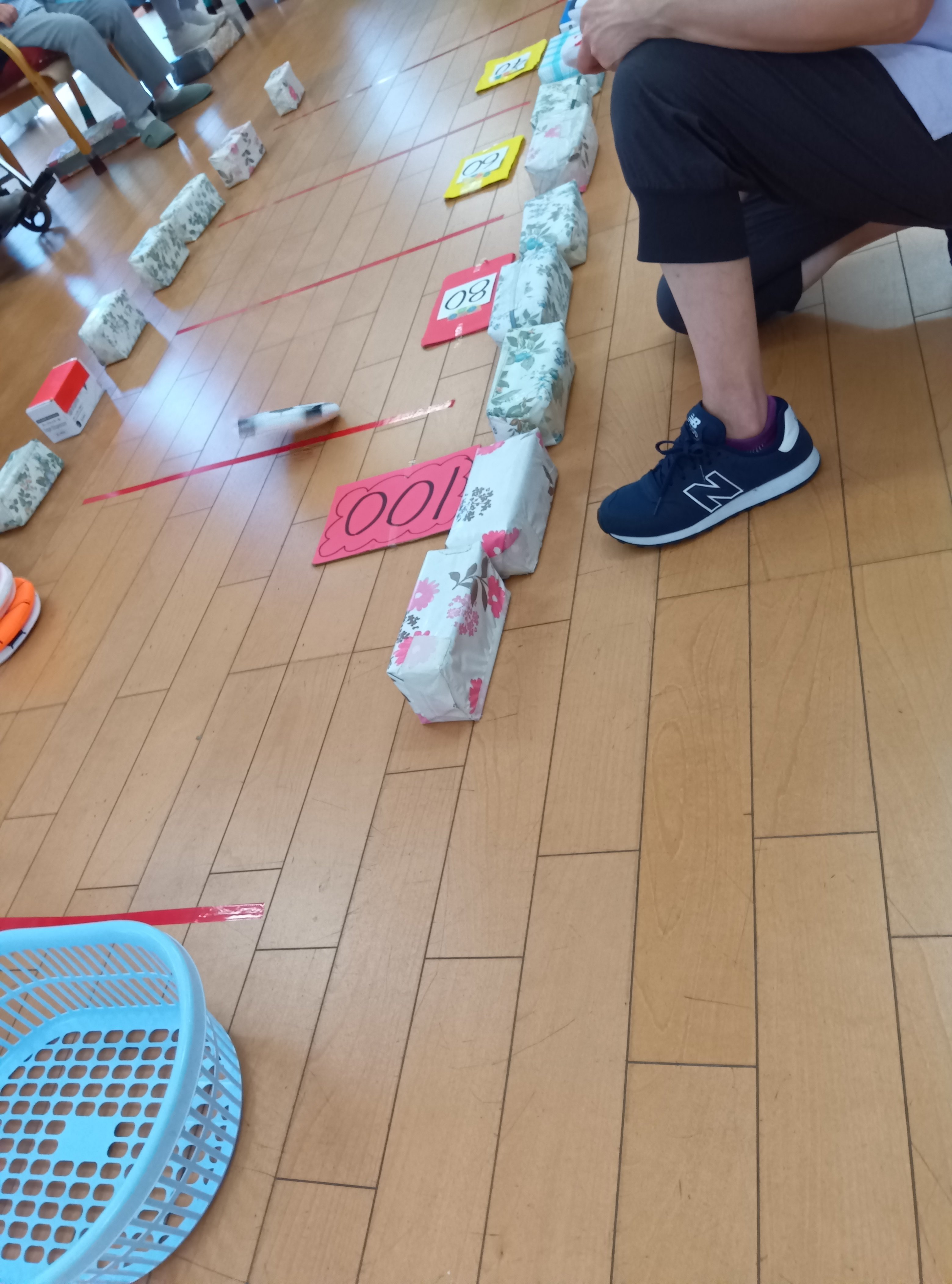 今日のデイサービスのゲームの床の目標範囲の写真です。