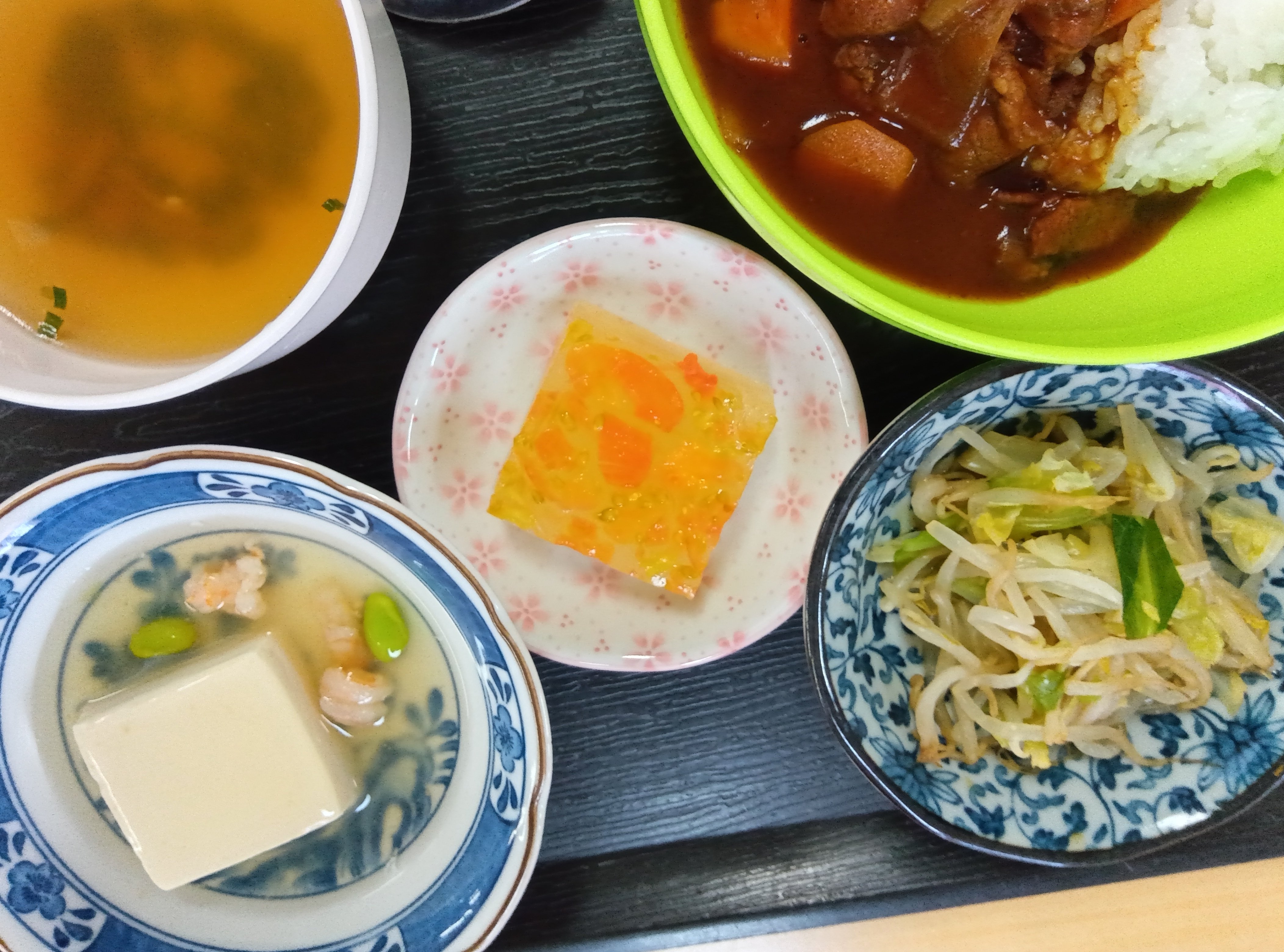 カレーかと思ったらハヤシライスだったんですね。海老のあんかけ豆腐、もやしと青菜の2色おひたし、香味スープ、そしてデザートはトマトのみじん切りを寒天で固めたもの。彩り豊かで美味しそうですね。