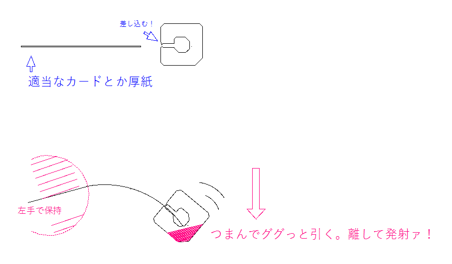 ・(上級技)リリースのとき左手のスナップを利かせると回転をくわえられる。熟練すると各段に気持ちよく飛ぶ。(つまんでる手でも回転を試みたけど、僕はできたことないです。やはり射出角度が狂うのがオチでした。)
