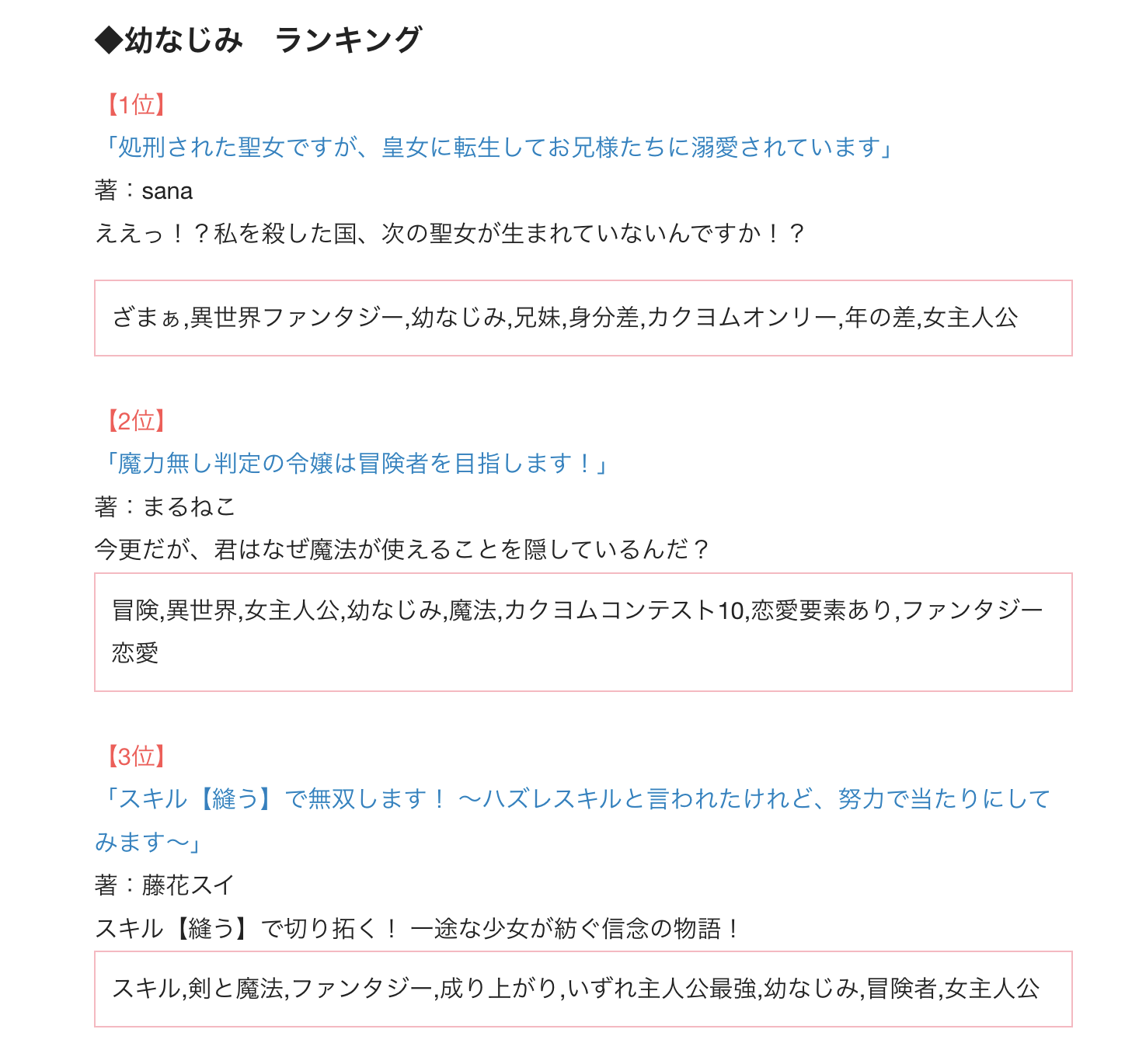 今になって気がついたのですが、『スキル【縫う】』が女性主人公限定タグ別ランキングの「幼なじみ」のタグの中で3位でした!