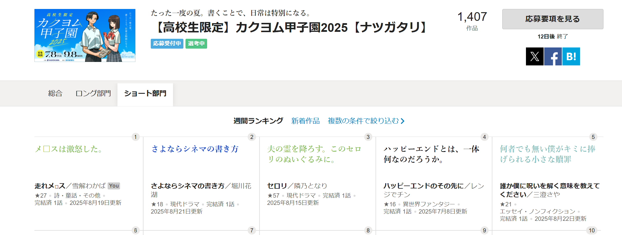 カクヨム甲子園創作合宿・第三回お題『メタフィクション』をもとに執筆した「走れメ□ス」が先日カクヨム甲子園ショート部門ランキングにて週間1位を獲得しました!