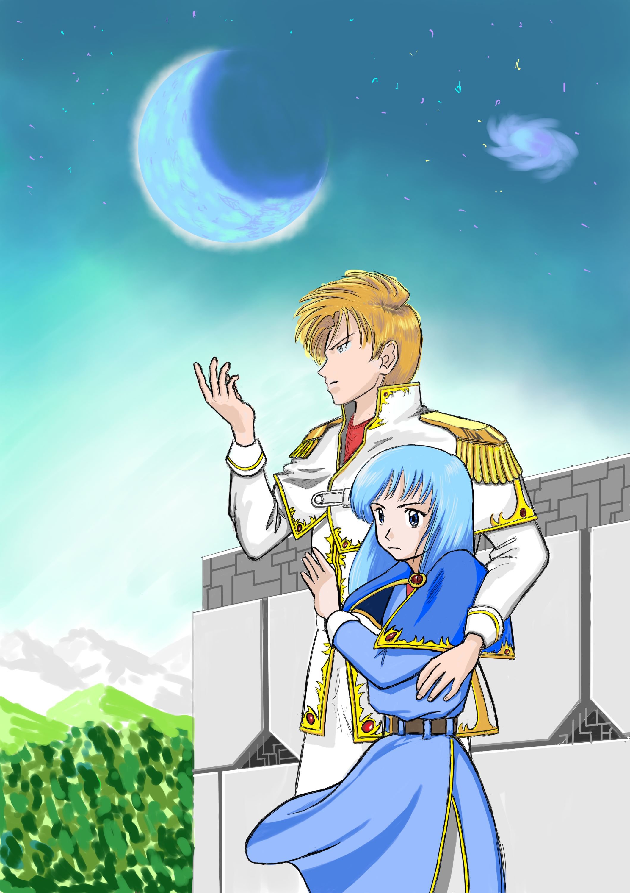 「ホームレスの俺が~」よりクレア星を出立する前のショーエンとシーナのイラストです。
