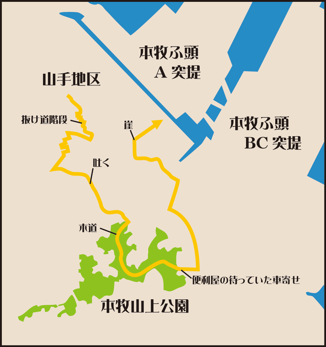 佳穂の自宅のある山手から、抜け道階段を走り下って、便利屋と合流。谷間の住宅街をカーチェイスして、気持ち悪くなって本牧山上公園下で下車。木道階段を駆け登って、小休止。公園を飛んで逃げて、便利屋の車の後部座席にダイブ。