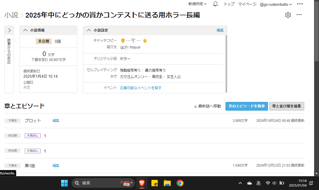 一旦止めてたホラー長編の執筆再開しましたのお知らせ。