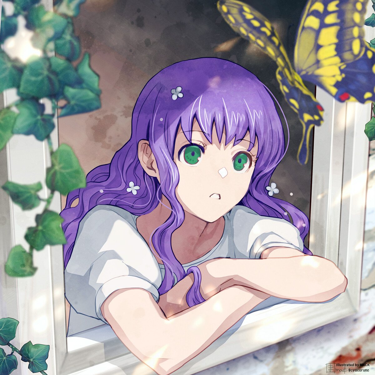 白い木枠の窓とかもねー、ヴィクターと一緒に住んでいるおうちのイメージピッタリなんですよ🥺ラエラの服が白くてお家も白いので、手前の緑やラエラの髪の紫色が映える✨そして紫の補色である黄色が蝶々に入っているので配色バランスも完璧ですよね。こういうのって計算してやっているのかなー。なんにせよMACKさんの画面構成力が垣間見える素敵な1枚です。