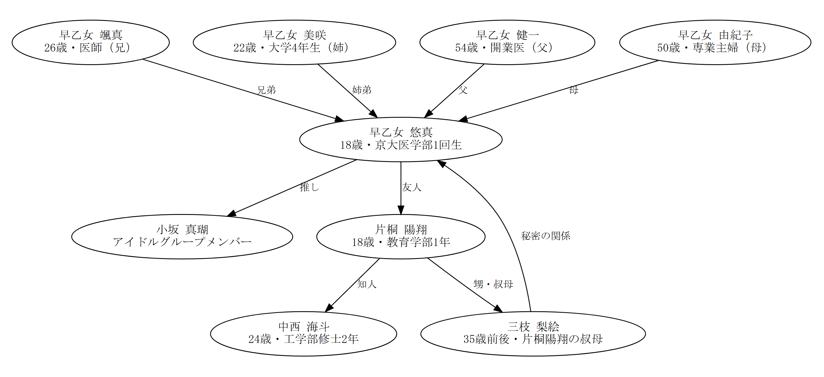 京都大学医学部1回生。厳格な家庭環境で育ち、兄・颯真の影響で「小坂真瑚」を推し始める。高校・大学受験を経て念願の京大医学部に進学。熊野寮で生活を開始する。