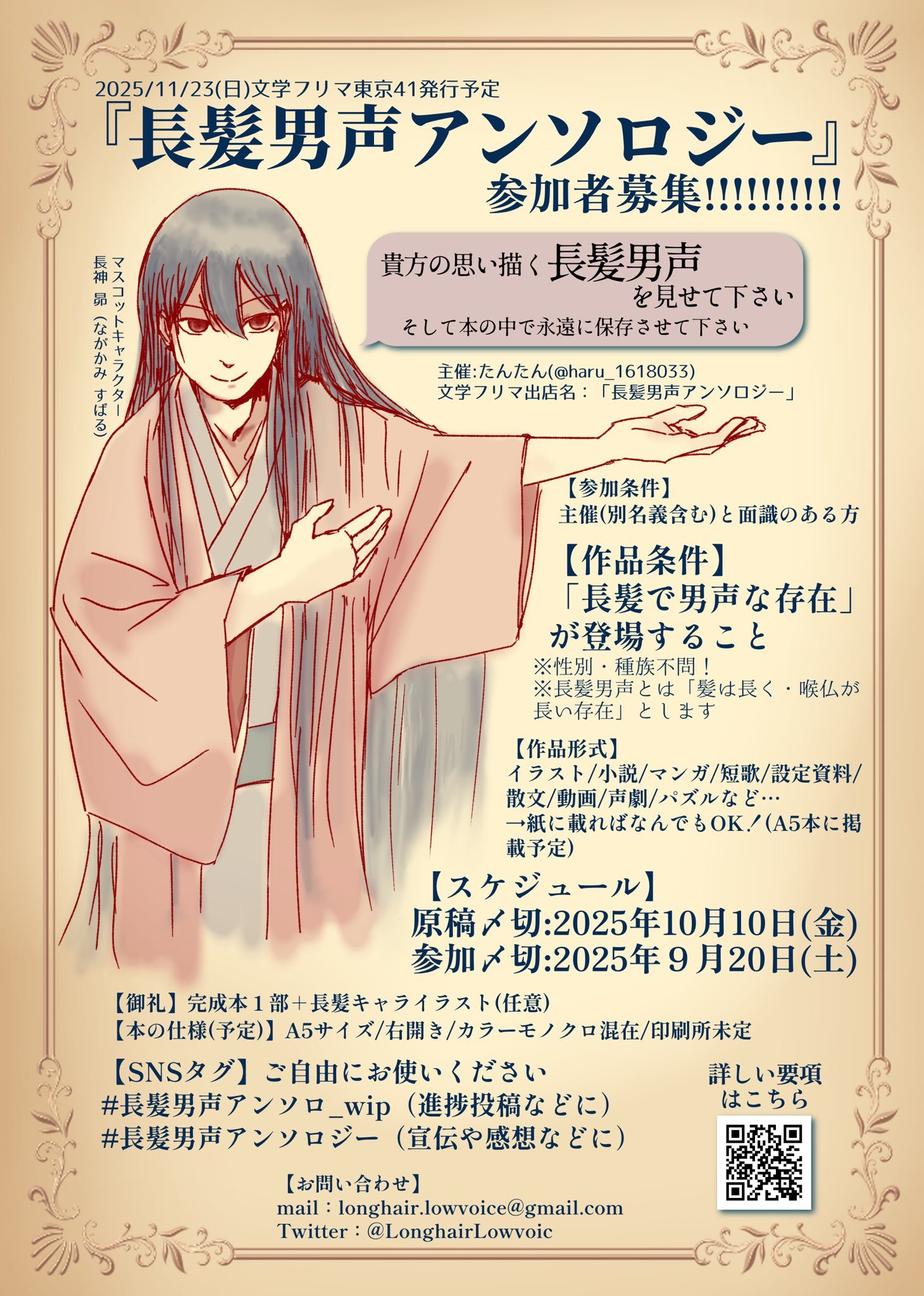「髪が長くて、喉仏が長い」存在の登場する話…小説に限らず、イラストも、漫画も、その他も?集めて本にして頒布するつもりです。