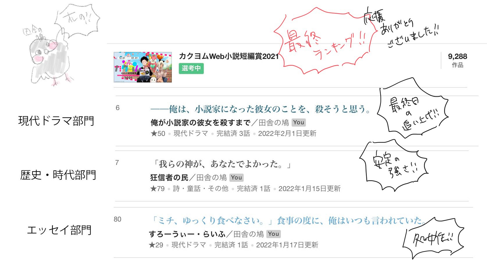 完成したのも終了間際一週間前とかで「どーやろな〜」って気持ちやったんですが、最後の星の追い上げがすごかったです。読者の方々にいただいた感想、めっちゃ大事にしていて(嬉しかった)、思い入れ深い作品になりました。読んでくださった方、応援してくださった方、ありがとうございました!