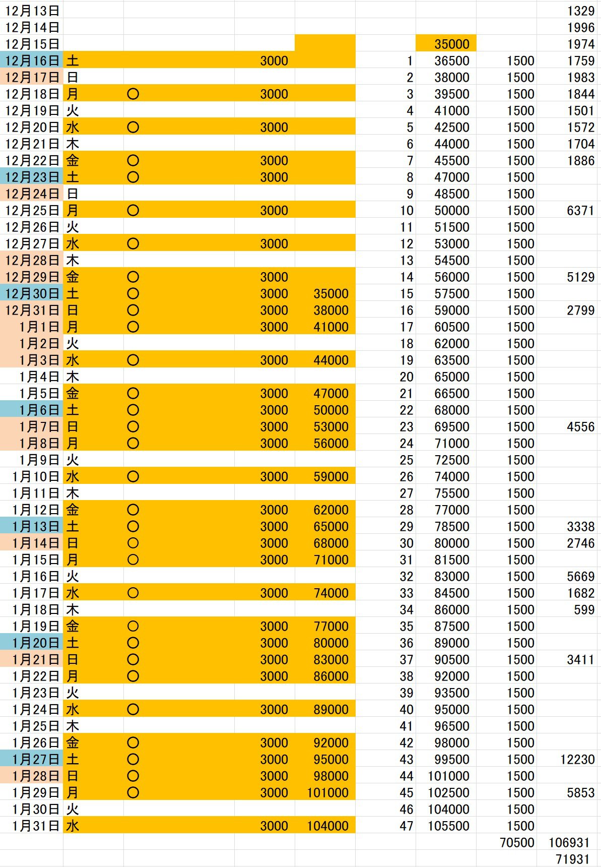 で対策を考えました。目標を、一部完結は目指さずとにかく10万字達成と割り切りました。執筆も、いつもは大雑把に「更新日にあわせて何千字」といった書き方をしていたのを、今回は毎日1500字(仕事から帰ってから12時に寝るまでの間に書けて、二日で1話分の3000字になる量)、何曜日に更新して、何日までに10万字達成といった進捗表(下掲の表 右端が実績 年始以外の飛び飛びは記録忘れのため)を作って着実に歩を進める作戦でやっていくことにしました。(この作戦の何がよかったか。やってみて分かったのですが、毎日1500字をこなしてさえいれば、1月31日には必ず10万字になると目に見えて分かったため、あと何万字もあるとか考えて焦ったりせずに済んだことでした)