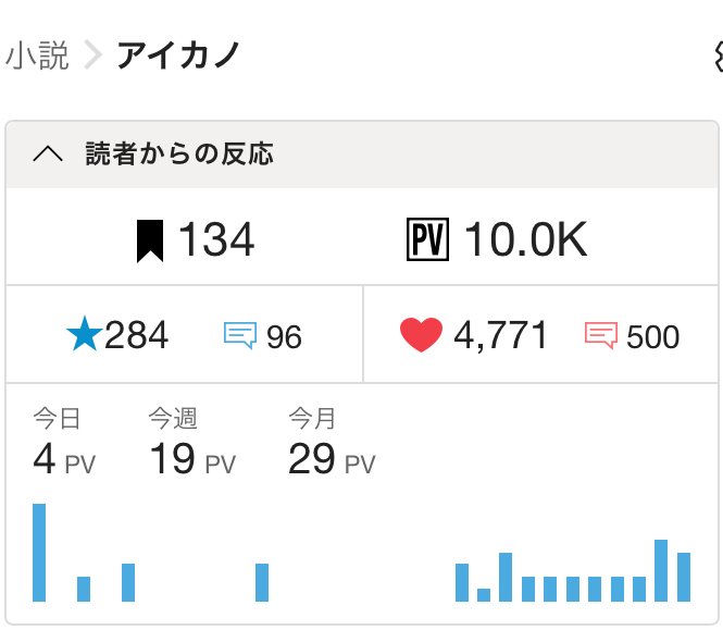 私の小説は読み専様ではなく作家様の方々に多く読まれる傾向にあるようです。時間はかかりましたが、コメント数500はPV10000より価値があると考えています。
