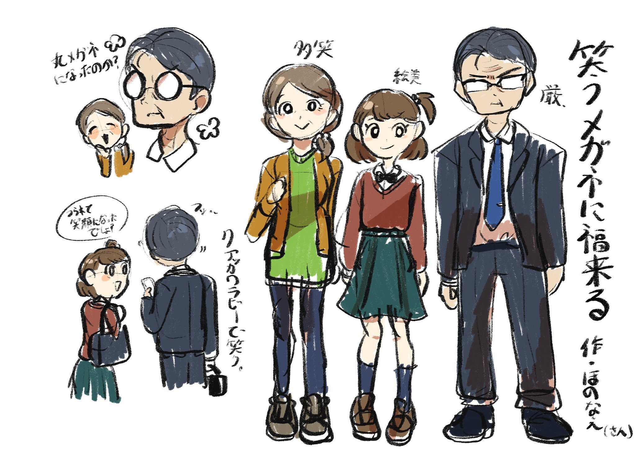 形までは描写しなかったのに、巌のメガネが□→○みたいになったところまでイメージ通りだし、絵美はとにかくかわいいし、多笑のどこかきゅるんとした笑顔は「クアッカワラビー」が見事に再現されていて……!服の色合いに至るまで、登場人物のイメージ通りで素敵!