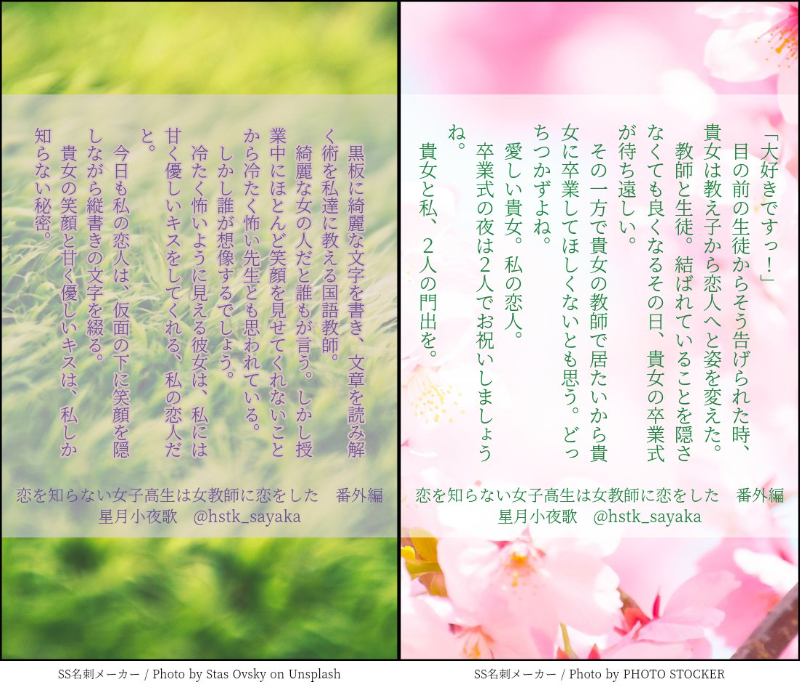 https://twitter.com/hstk_sayaka/status/1615341799081664513?s=20琴葉と櫻子、それぞれの視点からのSSを、SS名刺メーカー様にて作成しました。