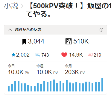 今日1日で10kPVのアクセスを頂きました。「飯屋のせがれ、魔術師になる。――知力ひとつで成り上がってやる。」