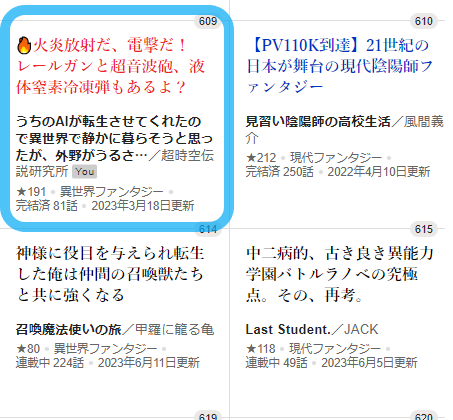 📈朝時点のコンテスト順位:609位🆙/2169作品