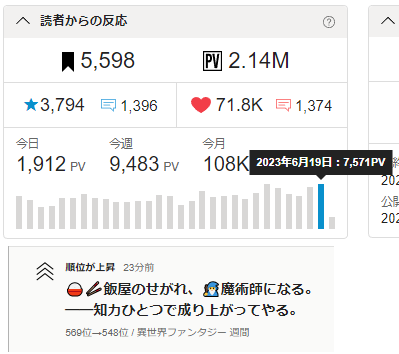 🖋作品フォロー数が5598人。もう少しで5600人。