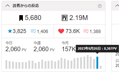 🖋土曜日が6kPV台で伸び悩んで、日曜日はどうなるかと思っていましたが、無難な8k台でフィニッシュ。🏁