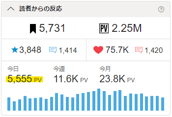 🖋21:30時点で今日のPVが5555PV。地味だが、悪くはない。👍