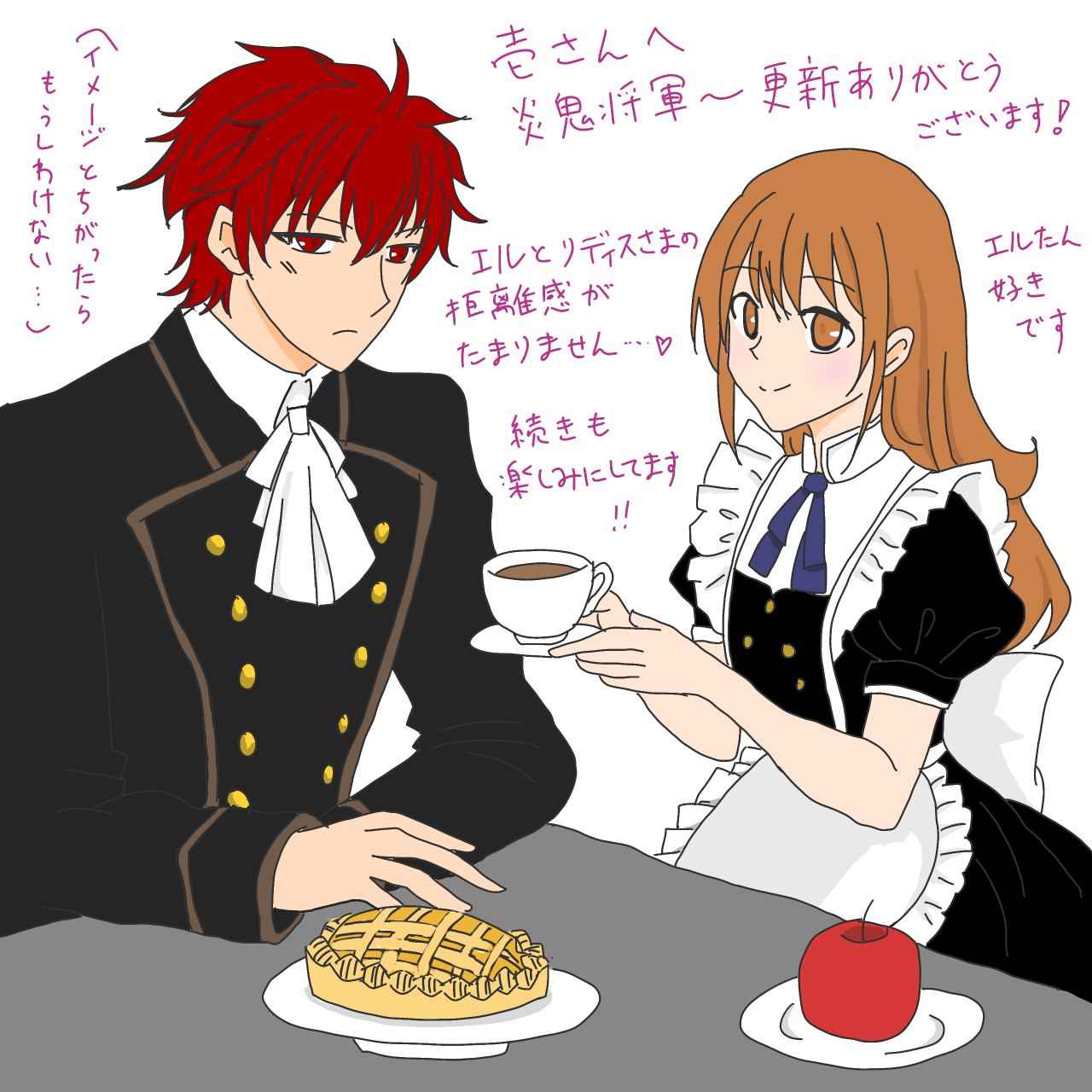 淡雪みささまより、「炎鬼将軍の隠れパフェ 〜最強武人を餌付けしたらふにゃふにゃに溶けちゃいました〜」の主人公エルと、炎鬼将軍ことリディス公爵のファンアートをいただいてしまいました!!! ひゃっほう!!!!!