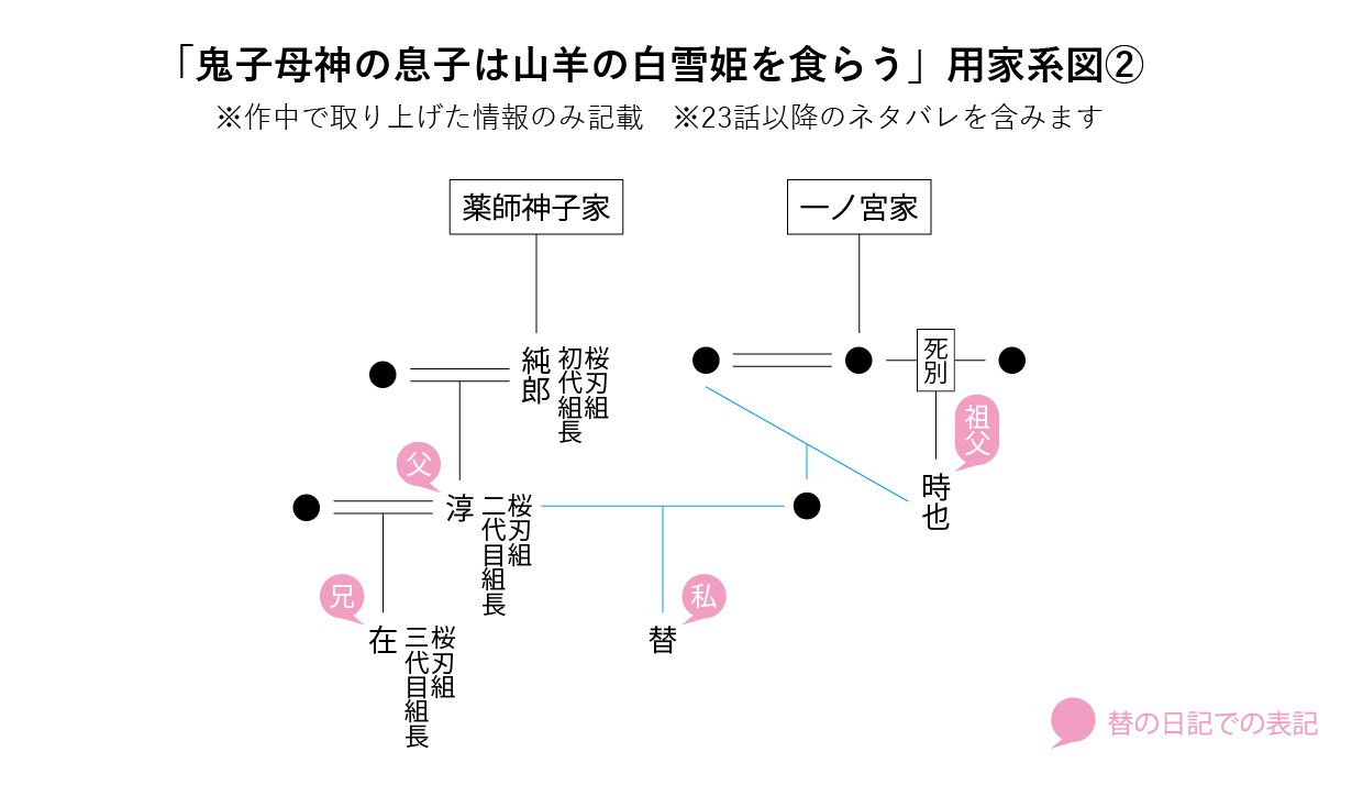 「鬼子母神の息子は山羊の白雪姫を食らう」家系図(2) ※23話以降のネタバレあり