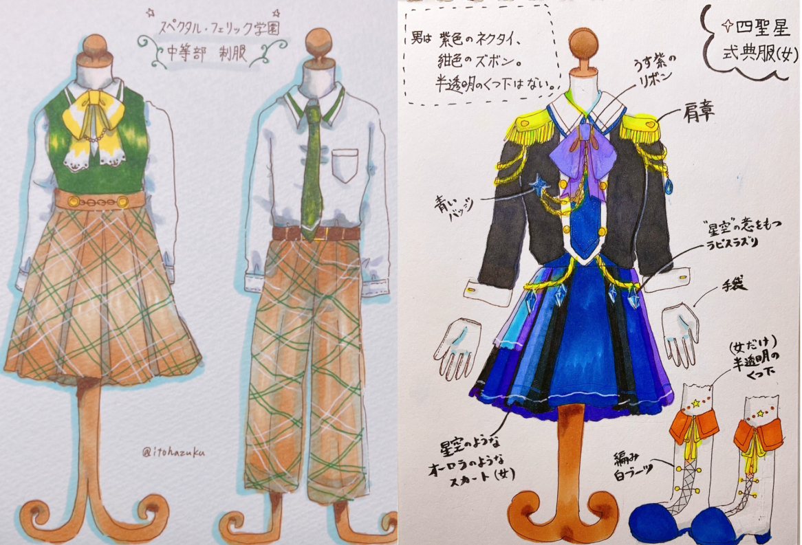 スぺクタル・フェリック学園【中等部】の制服と、四聖星【女】のイラストになります🍀