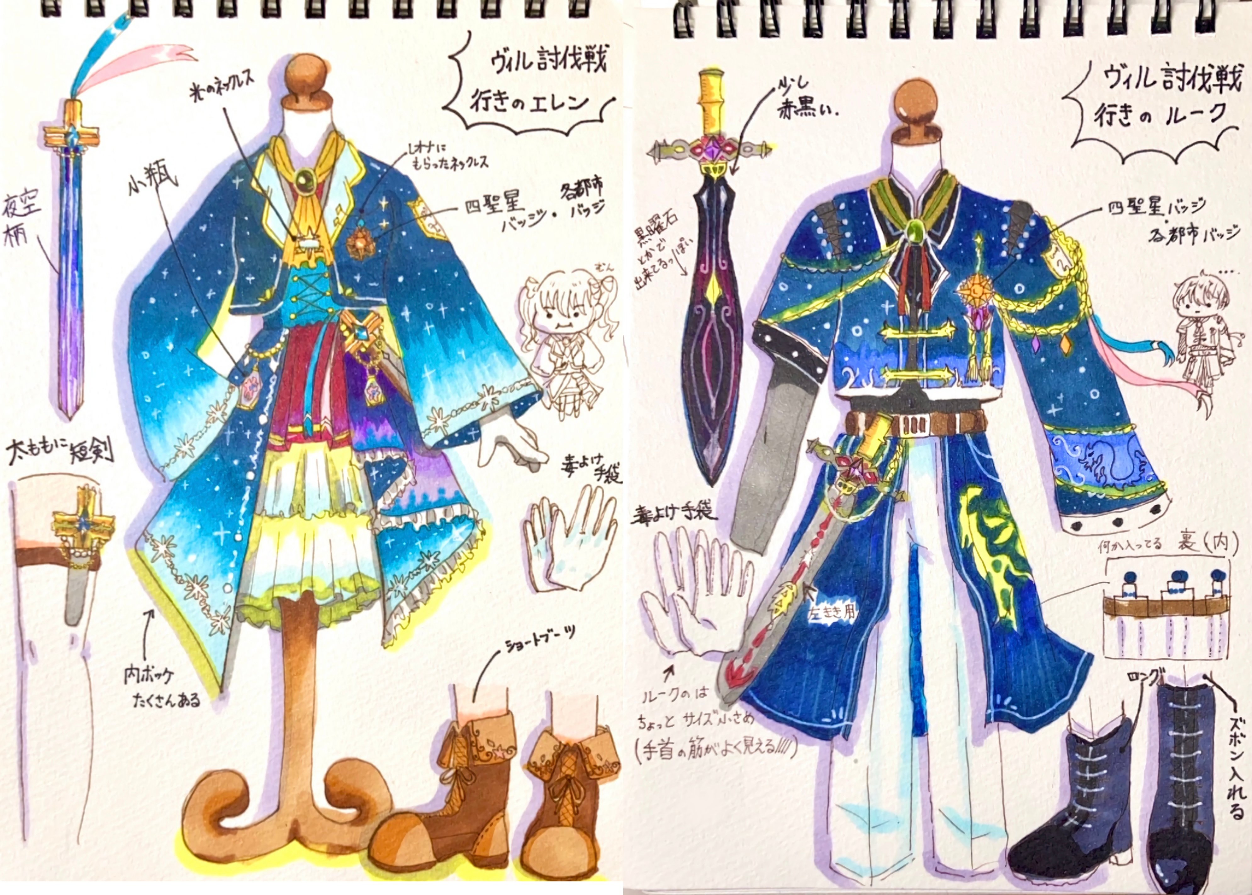 さて、連載をストップさせていたのを再開しました。戦闘用の服、デザインをイラストにおこして来たので見てください。今回はエレンとルーク!この服を着てバトルしている絵もいつか描きたいですね~