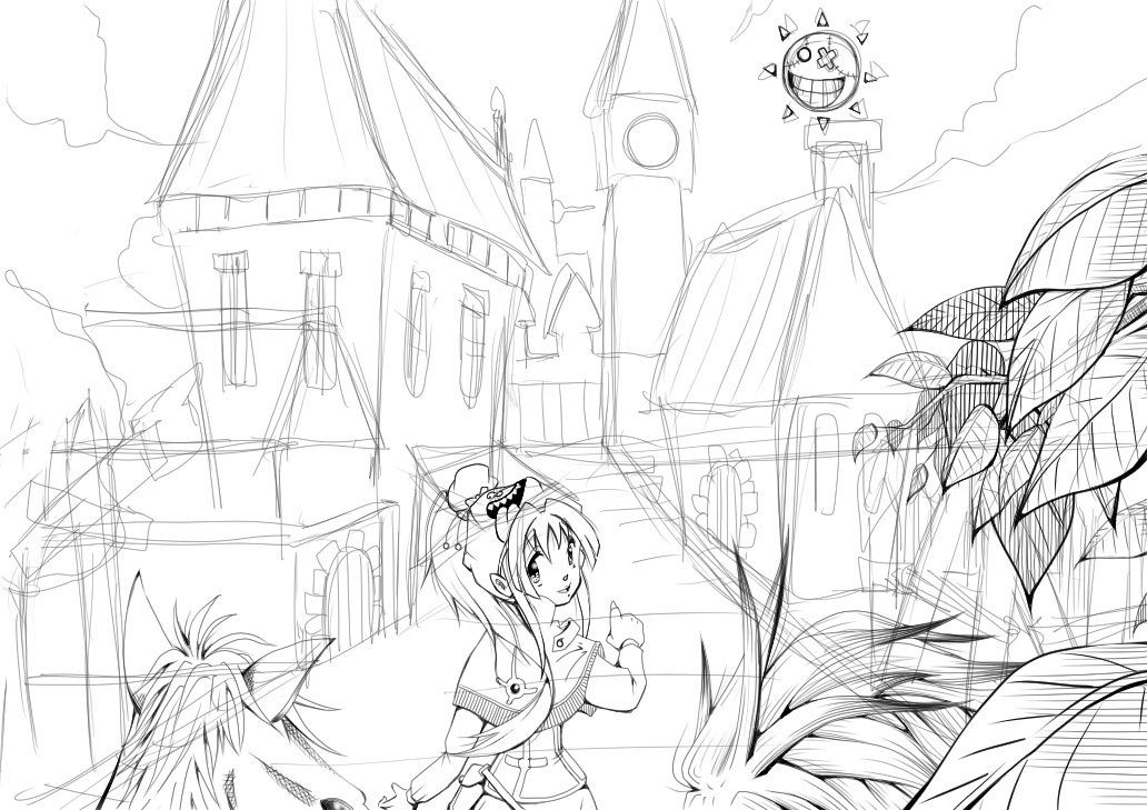 それと、白黒でとの事ですが、では、まずは白黒で漫画風味に仕上げてみますね。トーン処理は縮小や拡大に耐えれないので使わない方向でいきます。その後で色つきも見たければ着色という手順でいきましょう。ただ、ベタを最小限で抑えると灰色になります。それでも良いですか? 多分ですが、ベタを多用する事で画面が締まるとは思うのですが、まぁじんこぉるさんの希望通りに描きたいので抑えて描きますね~。