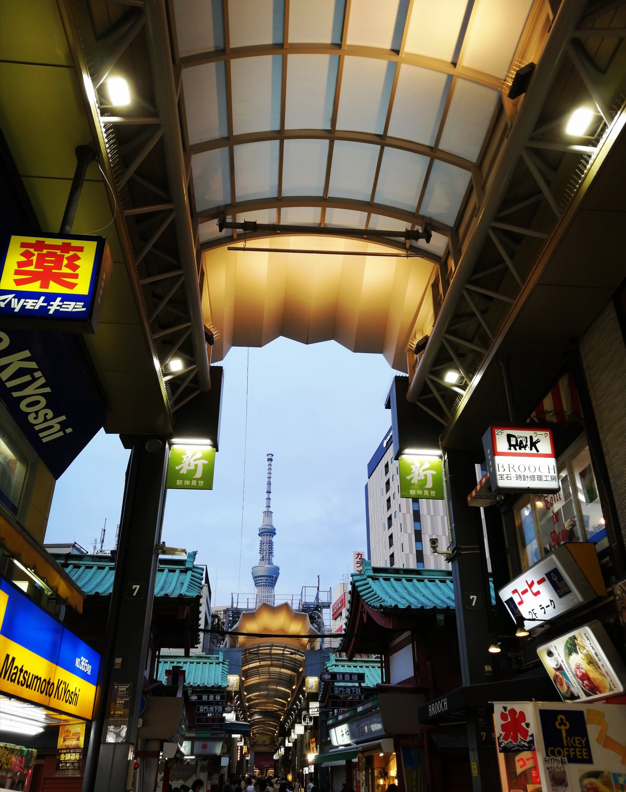 『徳仙』で天丼を頂き、『亀屋』で煎餅を購入。浅草寺近辺はアーケード街になっていて、東京スカイツリーが頭を覗かせます。