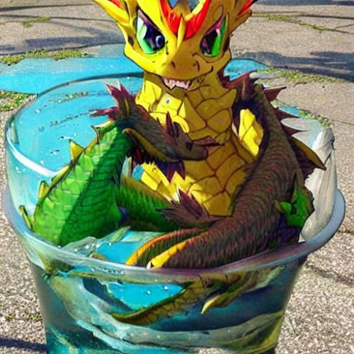 ミニ・ドラゴン系もしくはリザードマン系、水棲モンスター、コップ、グラス、水槽、黄色、ゴールド、かわいい、ペット