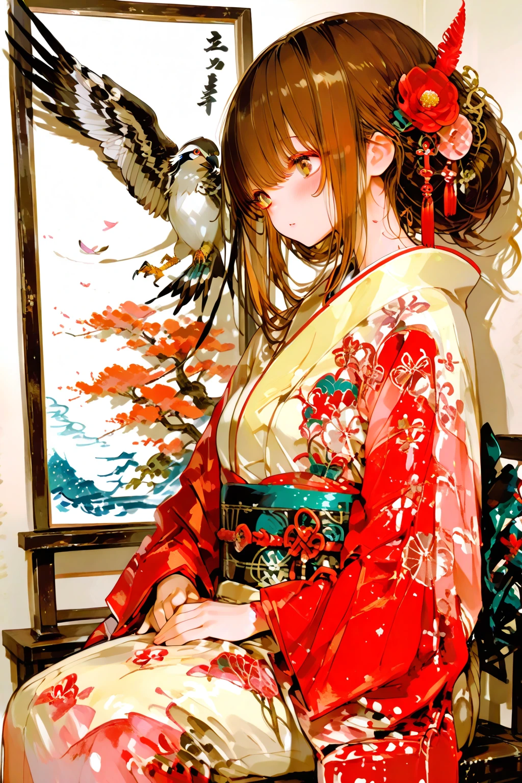 最高品質、芸術的表現、フォトリアリスティック、着物姿の美女の着替えシーン、茶髪の美少女、日焼けした健康的な肌、絵羽模様の着物、色鮮やかな袖、柔らかな着物生地、装飾品が少ない清楚な雰囲気、無垢な表情、ミサゴ(鶚)をモチーフにしたキャラクター性、鋭い眼差し、和室の落ち着いた空間、障子からの柔らかな光、着物が肩からわずかにはだける瞬間、繊細な手つき、美しい鎖骨のライン、猛禽類のような気品と強さ