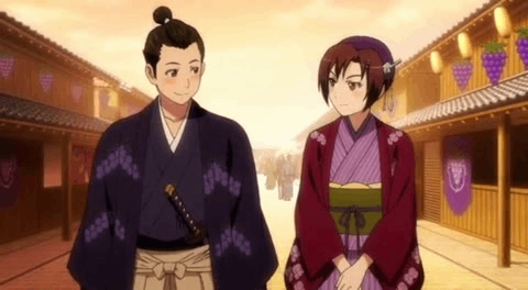 花坂を一大ぶどう産地にした後に、その城下町を仲睦まじく歩く弓削ちゃんと駒ちゃんです!