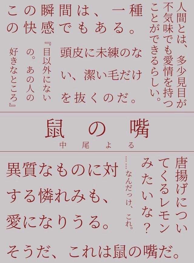 過去の小説を読み返すと、その構成や文章、台詞回しの拙さがよく感じられます。今回の「鼠の嘴」も数年後に読んだら拙く感じるかもしれませんが。