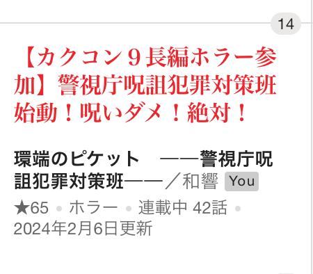 丸一日ぶっ倒れてて、全然観てなかったので、さっきカクコン長編ホラーを覗きに行ってきたら、今日のランキングは14位でした!本日のそのランキングに意味があるのかないのかはとりまおいておいて、嬉しかったです!
