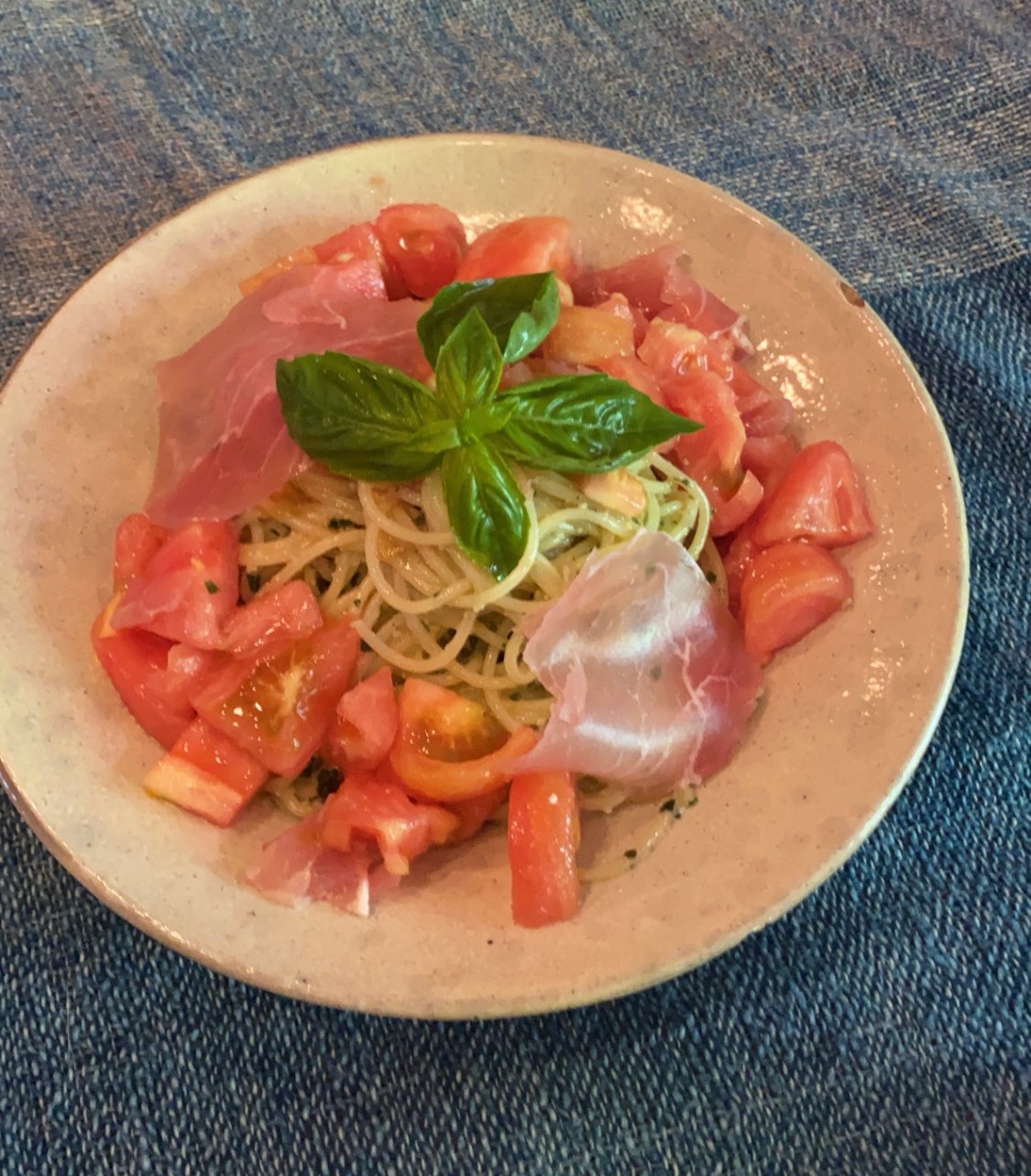 トマトを湯むきして、生ハムで味をつけて、ジェノベーゼたっぷりの冷製パスタは高級なお味がする〜!