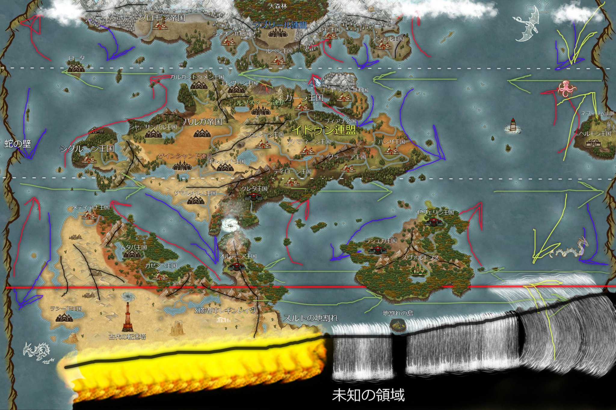 風の流れや海流を世界地図の方に追記しましたので補足としてご覧ください。