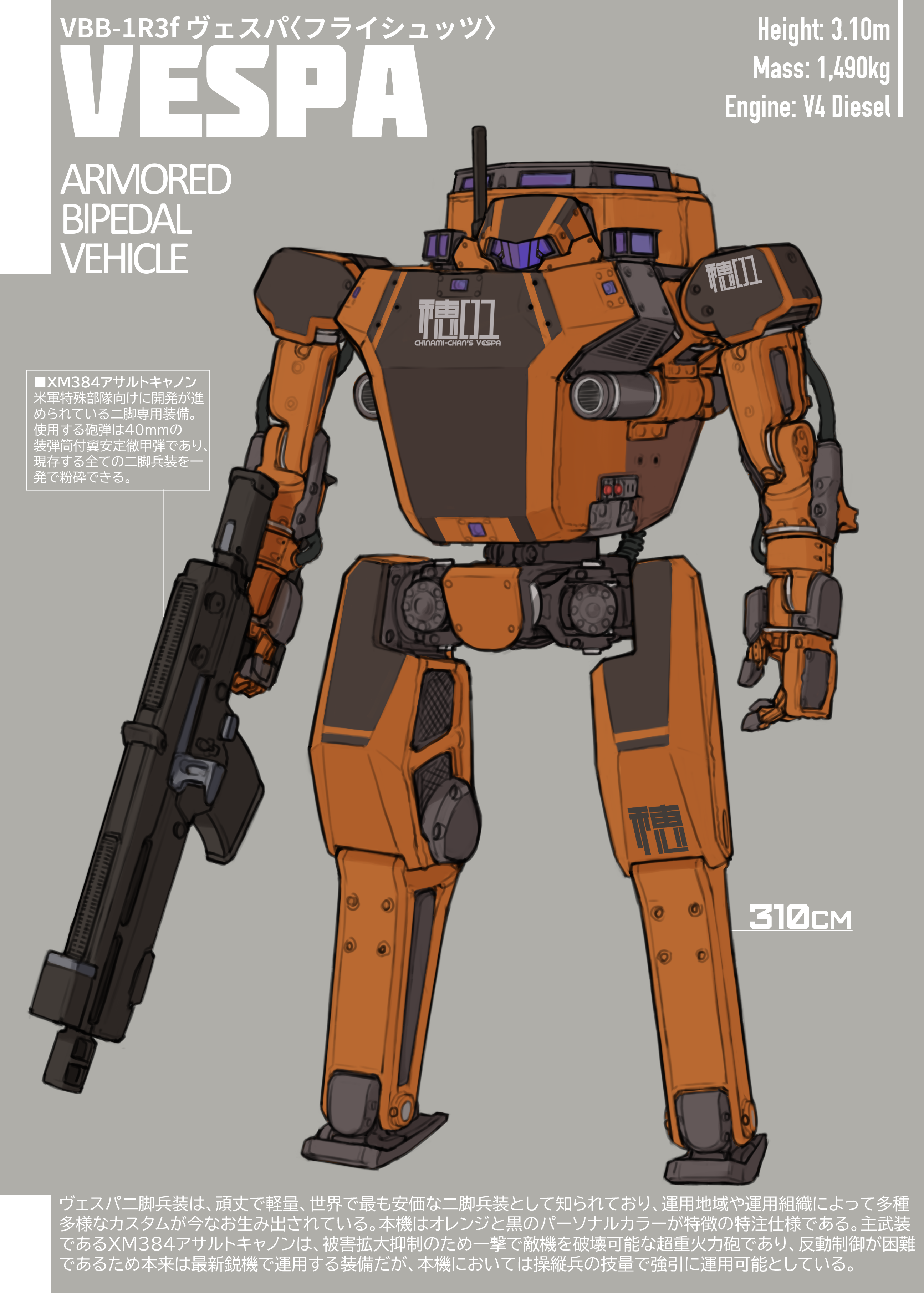 VBB-1R3f ヴェスパ・フライシュッツ。ザミエル戦以降、穂高ちなみがイディーロ社から譲渡されたR3試作型のヴェスパ。六号機まで存在し、主に40mm砲であるアサルトキャノンを使用する。