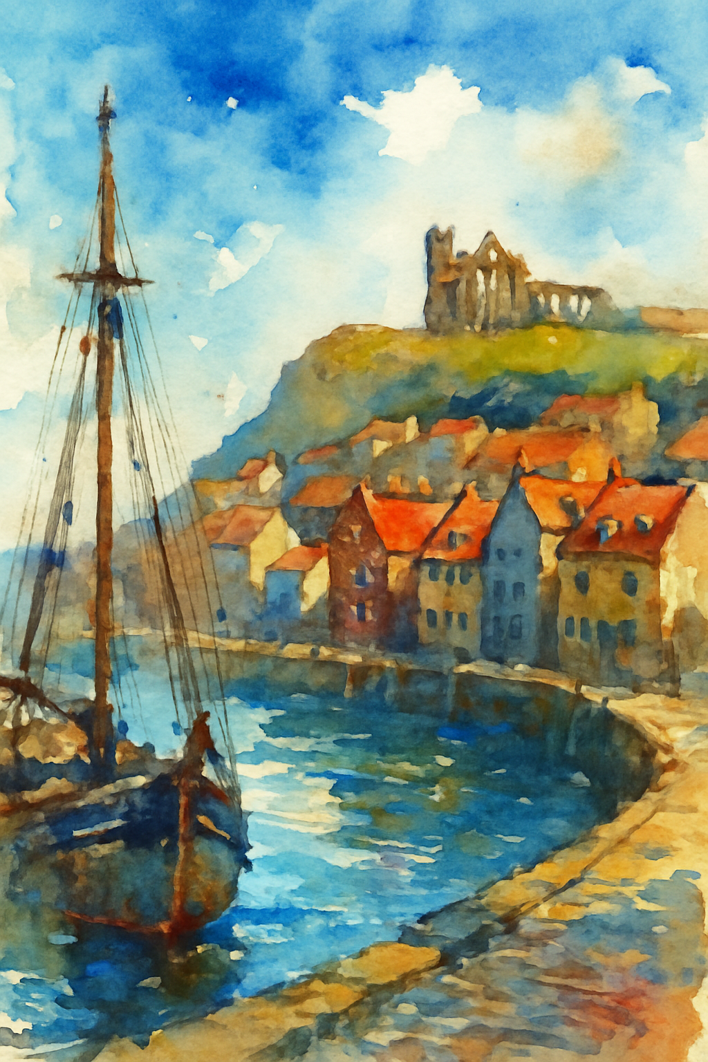 古い修道院のある,イギリスのWhitbyという港町をモデルにしています。夜明けに街中に霧がかかる幻想的な町です。作中にはそんな所はぜんぜん出せなかったのですが,異世界風でとても素敵な街並みです!