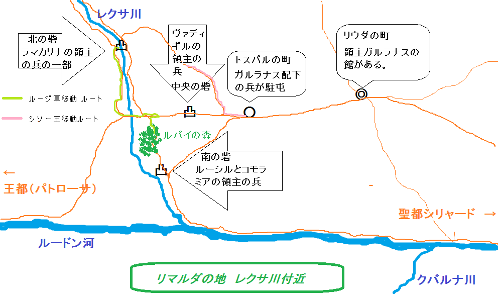 レクサ川の戦い。シュレーブ軍が築いた3つの砦と、両軍の移動経路です
