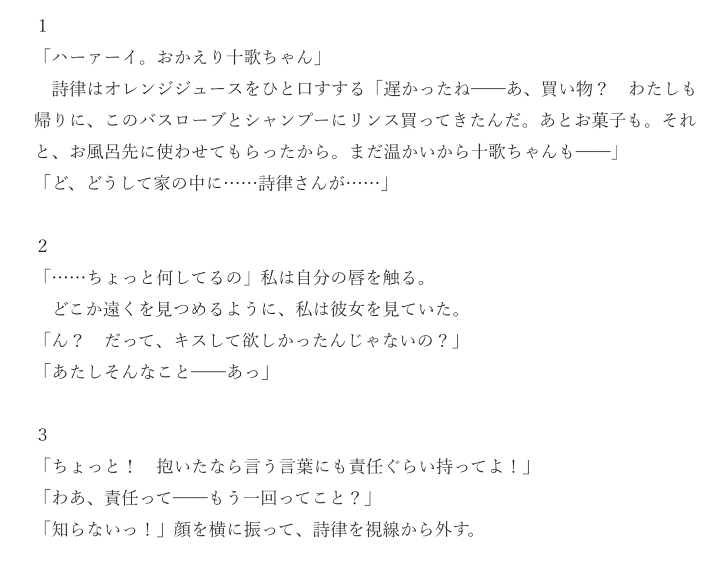 追伸、二月中には新作の百合小説やります。五万文字以上の内容にはなる予定で、かなり気合いを入れた作品となってます。