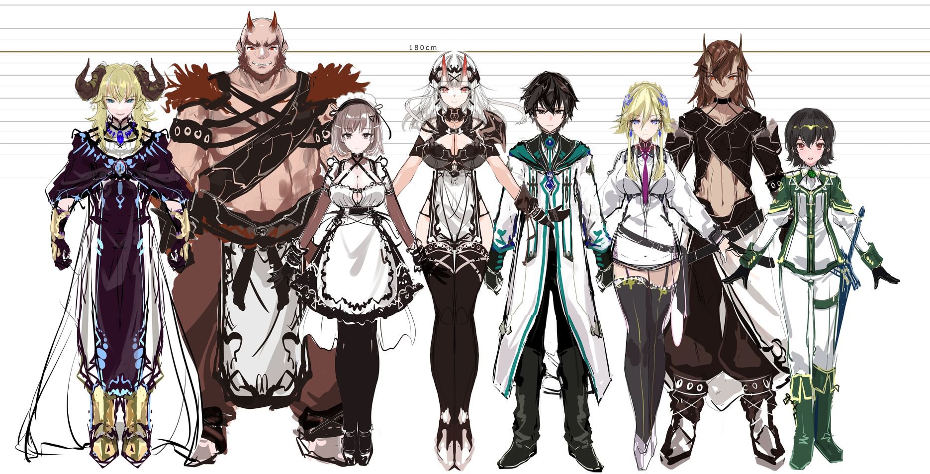 左から魔王陛下、ブレスト、リシェール、マリーダ、アルベルト、イレーナ、ラトール、リゼという並びになっております。