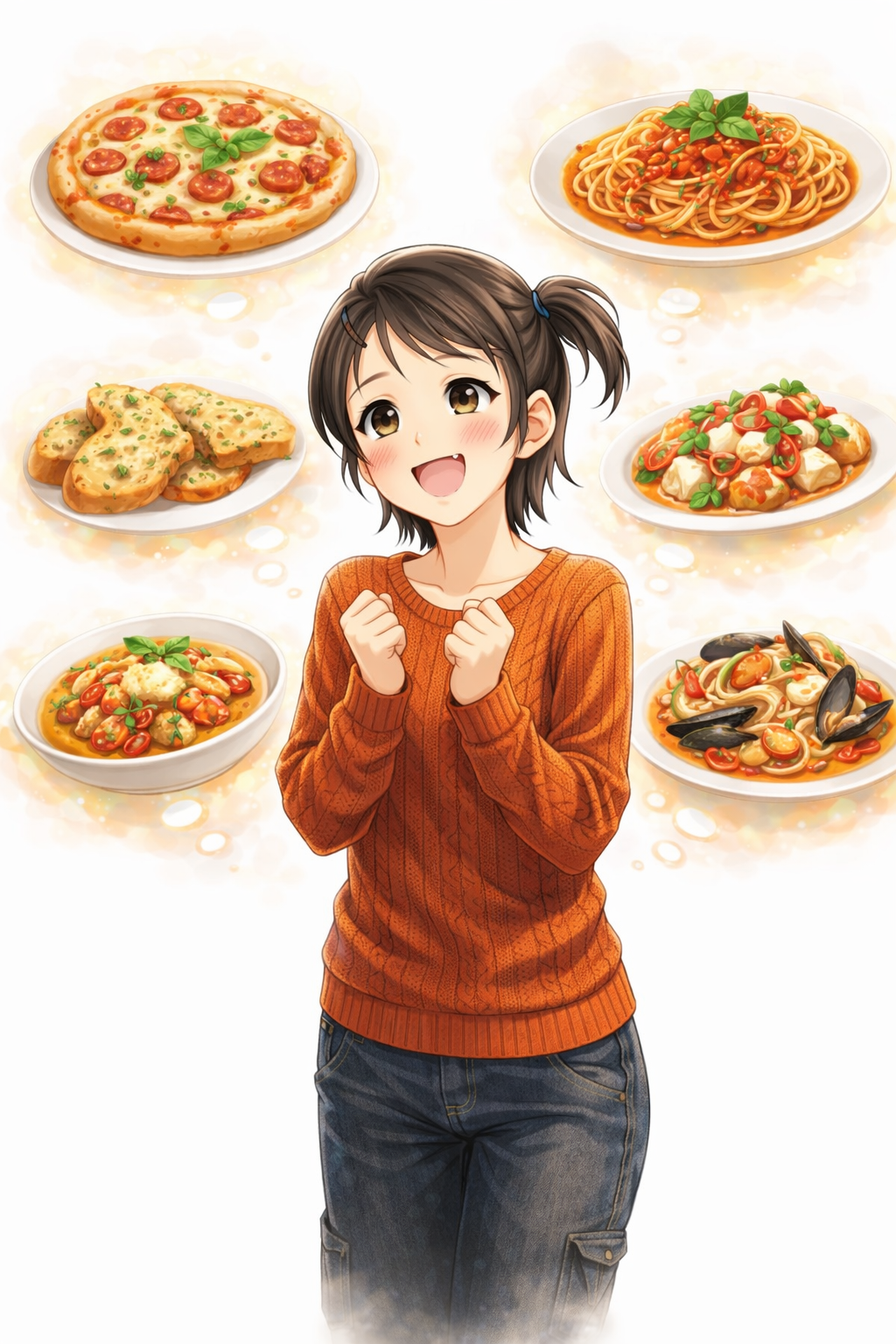 「うっれしいな。んふふふ~パスタでしょ、ピザでしょ、ドリア~、フォカッチャ~、ピカタにミネストローネ、アクアパッツァ……、あーん迷っちゃうううう」