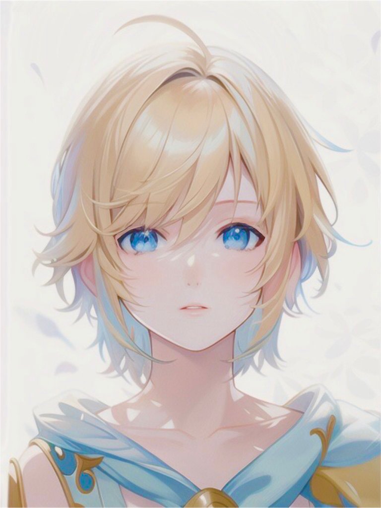 髪は緩く癖あり、白に近い…透明感のある金色、プラチナブロンド。
