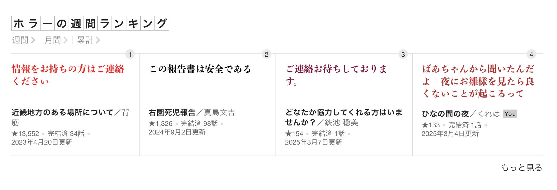 『ひなの間の夜』が、昨日はホラー週間ランキングの4位でした!今日はもう17位と下がってしまったのですが、昨日はカクヨムのトップページに表示されていました!